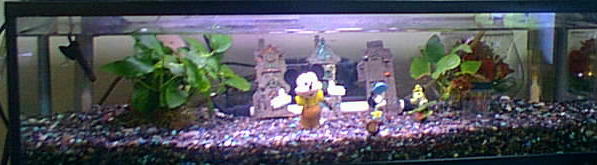 面倒なのが、長期休暇の時、このときは長期不在対応用の餌(白い石膏上のもので固めてあり、それが、時間とともに徐々に解け、餌が出てくるもの)と自動