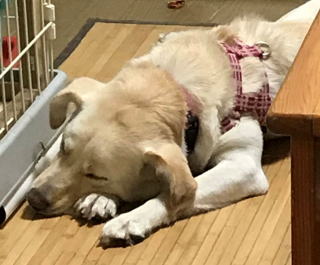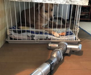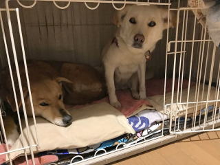 夜、寝るときは、ケージに入って寝ます。 お父さんが寝るときに、私たちに「ハウス」とコマンドします。 ルビーがなかなか入らなくて、いつもお母さんがケージの前まで抱えて行って、無理やり押し込んでいました。