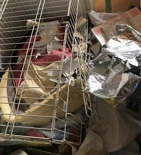 これは、1か月前の写真です。ラブ姉さんと一緒に寝ていたベッドが無残にも破壊されてしまいました。このころは、ルビーがケージに入ってもすぐに出ていくので、扉を閉められていました。しかし、中では・・・。