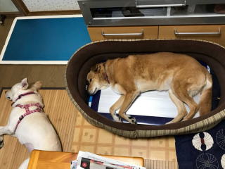 お母さんに新しいベッドを買ってもらいました。リビングにおいてもらってます。古いのはケージの中にあります。おかげで夜はぬくぬくです。