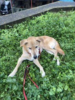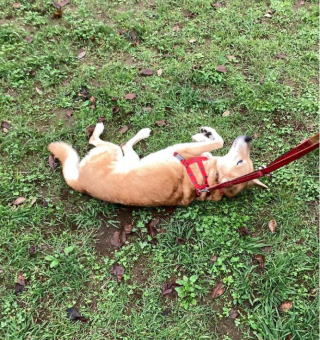 雨の合間に散歩に連れていってもらったのですが、公園の芝生で思わず背中ズリズリ。お父さん、お母さんは「下が濡れてるてるからやめてくれ?!」と、叫んでいますが、私はお構いなしです。 |