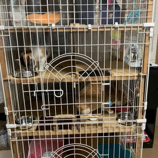 茶太には悪いですが、各階に仕切りを入れたので、広さが半分になりました。が、高さはそのままなので機嫌よく暮らしています。時々、ケージの外に出て走り回っています。