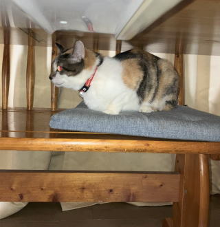 窓越しに夕日が当たる場所で、テーブルとベンチの隙間なので、茶太からの隠れ家的な場所がお気に入りです。