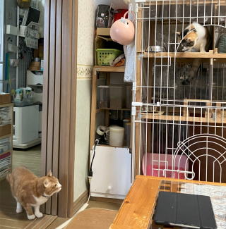 茶太はケージの下から杏を見上げています。早く友達になりたい様子。