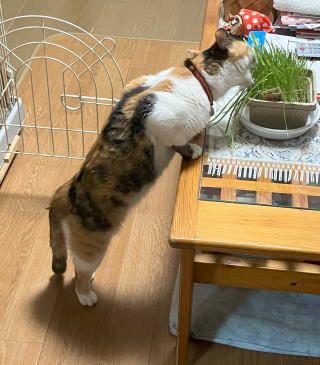 きっと草を食べたいのだということで、ニャンコ用の草を買ってもらい、茶太も杏も早速がっついています。一緒に食べればいいのですが、杏はまだ茶太にシャーを言うので、別々に食事中です。 |