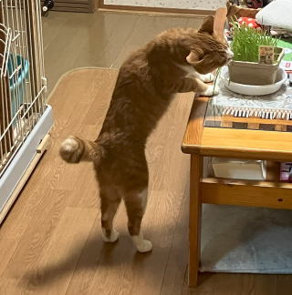 ここで、じっとしていたり眠ったりしているうちはいいのですが、時々、テーブルの上に行ったり、キッチンの電子レンジの中に逃げ込んだりします。
