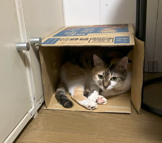杏は、たまたま置いてあったコーヒーボトル用の段ボール箱にはいってくつろいでいたので、その空き箱をリビングの隅に置いたら、いつもその中にはいってくつろいでいます。 |