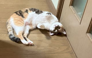 杏は、ケージから抜け出すとテーブルの下で涼んでいることが多いのですが、最近はキッチンの入り口でゴロゴロすることが多くなりました。