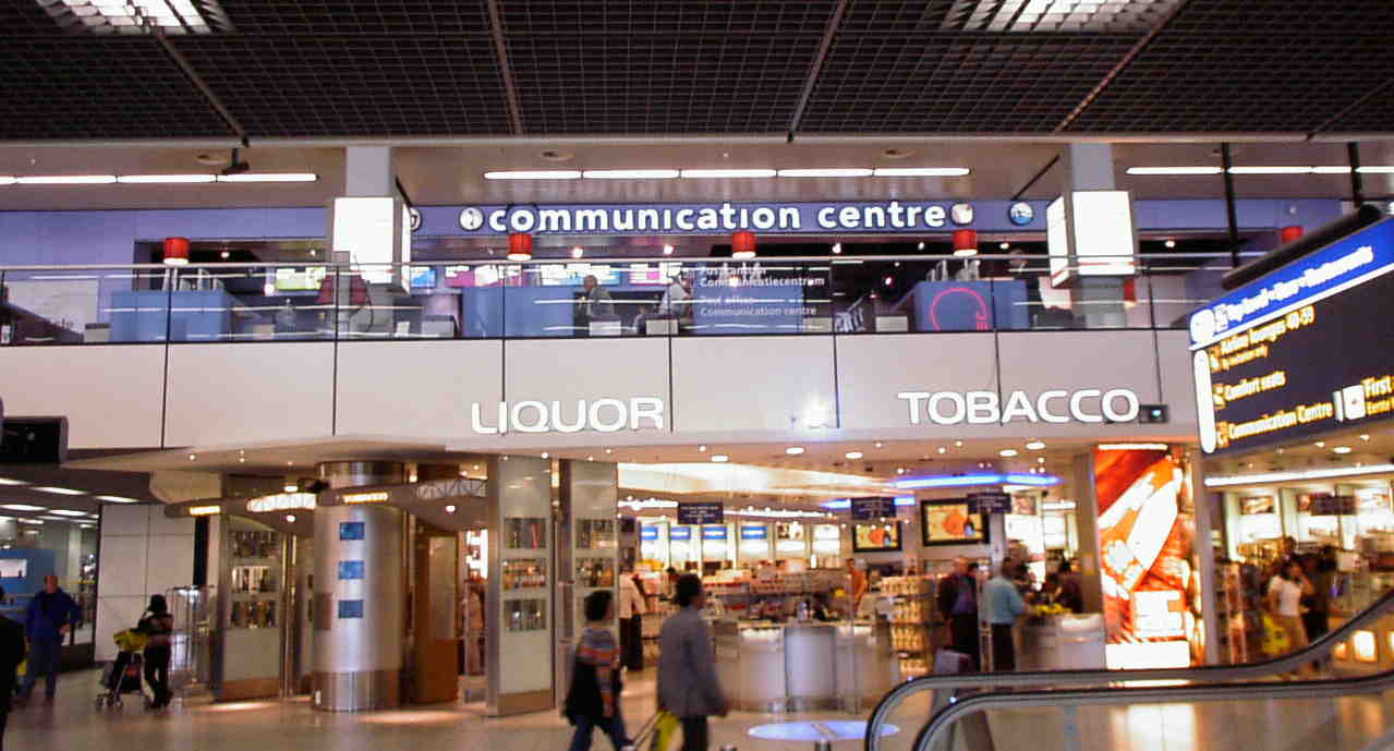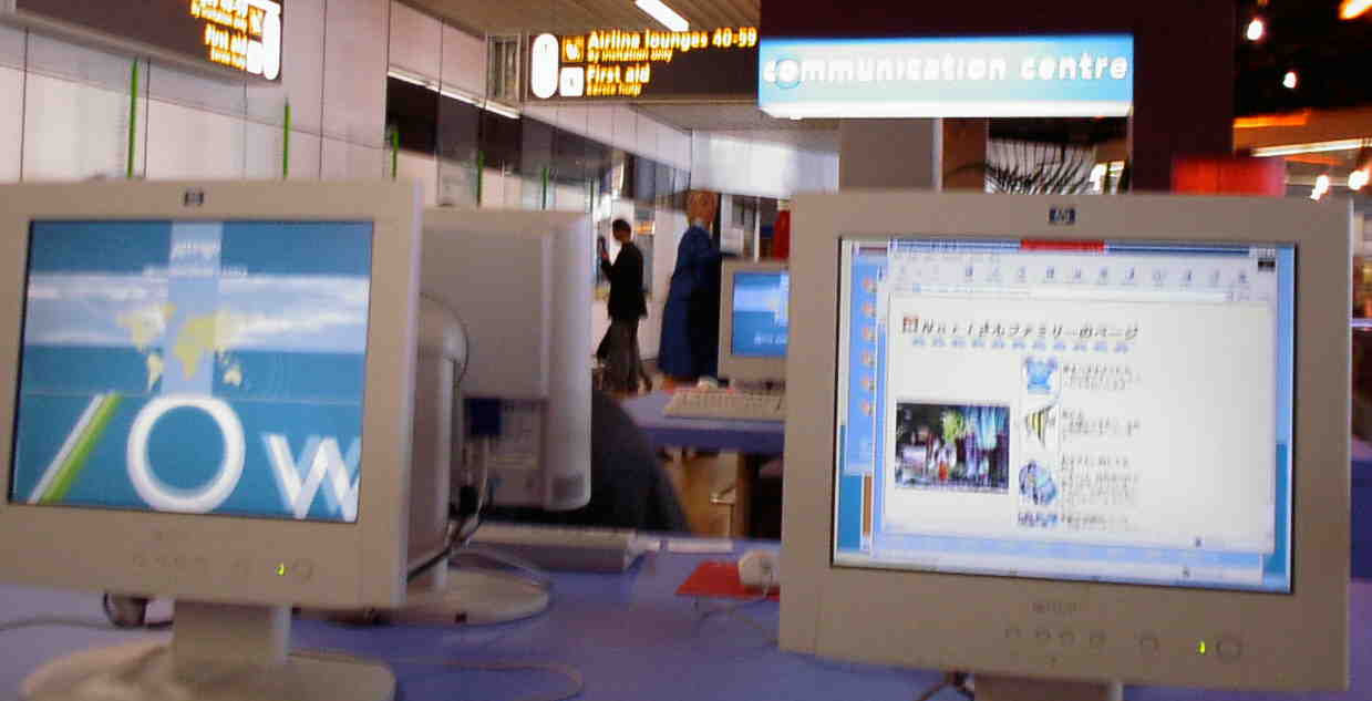 オランダ スキポール空港(2002/5/31) スキポールでは有料(30分:5.9ユーロ)でインターネットが利用できる。写真は国際線のカフェだが、国内線にも同じコーナーがあった。国際線では、 モバイラー用にダイアルアップ用の電話も用意されていた。