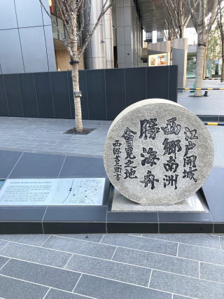 慶応4年3月14日に勝海舟が江戸市民を守るため西郷隆盛と江戸城無血開城を取り決めた会談が行われた薩摩藩屋敷跡