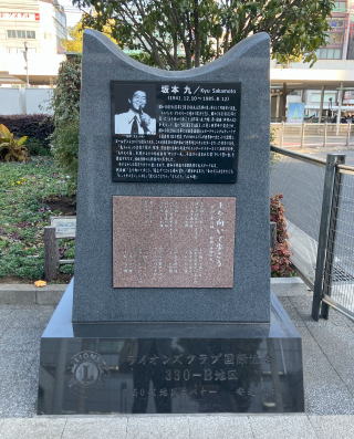 川崎区出身の坂本九の記念碑。プロフィールのほか、「上を向いて歩こう」の歌詞が刻まれています。