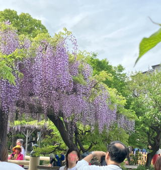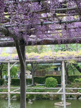 | 関東にはいくつかの藤の名所があるのですが、近くの亀戸天神の藤の花を見に行ってきました。平日にもかかわらず、結構人が出ていました。心字池にかかる赤い橋の上には人だかりで、橋の上から写真を撮っています。ここの藤は、いくつかの株に分かれていて池を取り囲むように配置されていました。 |  |