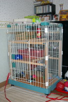 からないままケージに入れられて、それでもボール遊びに夢中です。