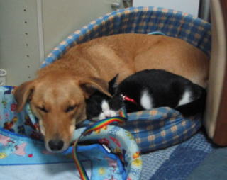 ついさっきまでは、小豆の引っかき攻撃とマリー頭突き攻撃の応酬だったのに、静かになったと思ったら、二人で一緒のベッドで寝ています。