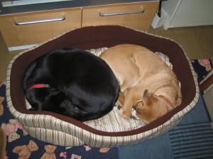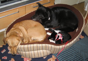 大きなベッドの中で寝ています。はじめはラブとマリーのためのベッドだったのですが、そのうち小豆も入ってきて、3匹仲良くベッドの中に入っています。