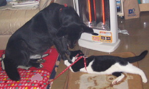 寒くなってきたのでストーブを出したら、ラブがストーブで温まっています。そこへ、小豆がやってきて、2匹で遊んでいます。と言うより、小豆がちょっか