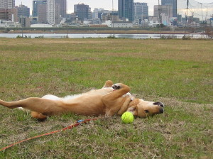 行ったとき、野球場があったので、ラブもマリーも走り回りました。マリーは得意のヘソ天背中ズリズリ運動。向こうに見える川は淀川でその向こうのビル群は