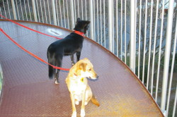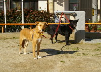 年12月31日 五月山に行 きました 昨日は長い間自動車に乗っていて疲れましたが、今日は一日中大阪にいる日です。朝、いつものように淀川に連れて行ってもらいました。ここは、野球のグラ ウンドがいくつかあって朝早いと誰もいません。それで、リードをはずしてもらって、思い切りマリーと走り回れます。ただ、今日はほかのワンコもいたのでロ ングリードにつながれて走ったり、マリーとガウガウしたりしました。 久しぶりの淀川の河原のにおいだね。