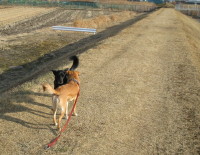 年01月19日 寒い日が続 いています ここのところ毎日毎日寒いです。寒くなるとマリーは散歩にも出てきません。そんなときには、私だけで散歩します。 今日は休みの日だったので、少し遅い時間にお父さんが連れて行ってくれました。少し暖かくなるとマリーも散歩に飛び出して行きます。天気もよかったの で、いつもの川沿いを散歩しました。ここは、農道とつながっている道で、車も来ないし、ほかのワンコがくればすぐわかるので、時々リードなしで散歩させて もらえます。土手の上で、マリーとガウガウをしました。風がないのでそれほど寒くありません。実は私の毛は二重構造なのですがマリーは一重なのでそれで私 より寒がるようです。日差しはあったかいけど、水溜りには氷が張っていましたよ。川を見ると白鳥が泳いでいます。寒くないのかな?? この間の15日に4歳になりました。寒い時に生まれたから、私はあまり寒さは気になりません。 川沿いの散歩コースで、今日はマリー