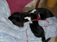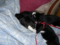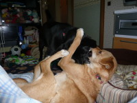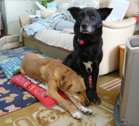 年01月21日 今日も寒い です 散歩は好きだし、ホームセンターにも行きたいけど、寒い日はファンヒーターの前でごろごろしているのが一番です。昨日は、 ファンヒーターとお母さんの間で寝そべって、お母さんに布団もかけてもらったのに、小豆がなんと私にいたずらをしてくるではありませんか。眠たかったし、 相手にするのも面倒なのでほっておいたら、小豆はぺろぺろ私をなめ回し始めました。ま、悪い気はしないので、そのままじっとしていよう。 マリーとだったらなかなかそうは行きません。今日はホームセンターに連れて行ってもらいました。ホームセンターではおとなしいねとまた声をかけてもらっ たし、お母さんにフードやおやつをたくさん買ってもらって、ハッピーなのだけれど、その分散歩が短くなって、マリーとガウガウする時間が余りありませんで した。それで、家に帰ってガウガウしています。これも暖かくなるので結構いいですよ。 |
