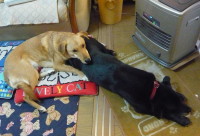 土手に上がってガウガウをして、それから二人でへそ天背中ズリズリ運動です。 ![]() ![]() 夜になるとファンヒーターが恋しくなります。ファンヒータの前には私用のマットが敷いてあります。でも最近はマリーが私の真似をしてファンヒータの前に 座るのですよ。暖かいので、知らない間に寝てしまいました。 ↓お母さんの座布団の上でファンヒー