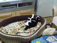 年12月30日 大阪へ行き ました 一番上のお兄さんは仕事があって行けなかったけれど、みんなで大阪に行きました。大阪まではかなり遠かったです。途中、事故での渋滞が2回ほどあってな かなか車が進みません。それで、私やマリーが外に出られる時間も少なくなります。今回、マリーは車酔いの薬を飲まなかったです。ワンコ用の車になったから か、お父さんの運転が丁寧になったからかわかりませんが、マリーは途中で車酔いすることもなく元気でした。たぶん、マリーが強くなたからだと思います。 それと、もうひとつマリーがえらかったのがオシッコがちゃんと我慢できたことです。途中のサービスエリアで外に出してもらったとたん、マリーは草むらの ほうに走って行ってオシッコです。 それに引き換え、小豆は相変わらず外嫌いです。車の中で、お姉さんが小豆を抱いて窓から外を見せようとしたとたん、「ギャー」と叫んで自分のキャリーの 中に逃げ込んでしまいました。 01月03日の写真を見ればすぐわかりますよ。 大阪のおじいさんの家では、どういうわけか家の上に上げてもらいました。下の写真は、お父さんたちが食事が終わった後で呼ばれて、畳のお部屋に入ったと きの様子です。うれしいと言うより、ビックリですね。 ![]() ![]() ![]() 夜は、私もマリーも小豆も自分のキャリーの中で眠るように言われていたのですが、小豆は寒いのか、寂しいのか、マリーのキャリーに入ってお休みです。マ リーが外に出ると付いて出て、中に入ると一緒に入ります。本当に小豆は臆病で、誰かが通るたびに階段や机の下に隠れたりします。私は、お父さんの言いつけ どおり自分のキャリーでじっとしていました。「相変わらずクレートは完璧だ。」とほめてもらいました。 マリーと小豆は仲良く一緒に寝ていま
