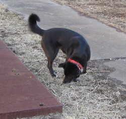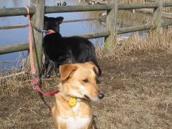 「鴨がたくさんいました。ラブ姉さんは鴨に気が散ってしまってあっちを向きっぱなしです。」(マリー) 夕方の散歩は家の近くの川べりの土手を歩くコースです。時々、立ち止まっ