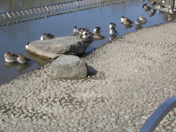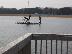 年02月11日 手賀沼に連 れて行ってもらいました 今日は朝からいい天気です。朝の散歩は手賀沼に連れて行ってもらいました。手賀沼にはサイクリングロードやジョギングコースがあって、時々、散歩に連れ て行ってもらいます。今日は、水の館のほうに連れて行ってもらいました。水の館と手賀沼の間にミニ手賀沼と言う本物の手賀沼を小さくした池があります。そ の中に私の大好きな鳥が泳いでいます。人がたくさん通るので、リードはお父さんがしっかり握っていました。残念。すぐに池のほうに行って鳥さんたちと仲良 くなるのに。 手賀沼の河童の像です 写真を撮ります。「すわれ。待て。」
