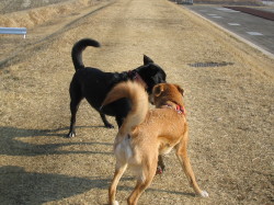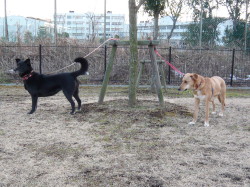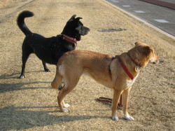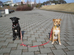 年02月23日 今日は暖か です 今日は結構暖かいです。ついこの間までは寒くて、マリーも朝の散歩は渋っていましたが、今日は元気に飛び出して行きました。お父さんが間違って私のリー ドをマリーに付けようとしたところ、マリーは首を下に下げてつけさせようとしなかったので、お父さんがやっと気がつきました。 マリーはハーネスをつけて散歩に行きます。ハーネスをつけるときには、ちゃんと手を上げて、お父さんたちがつけやすくするのですよ。 いつものように、近くの川の土手に行きました。暖かいし、誰もいません。私もマリーもリードをはずしてもらって走り回りました。 マリー:「お父さん。呼んだ? 私たち、走るのに忙しいのよ。」 ラブもマリーもガウガウの真っ最中です。 「ンッ? 鳥だ!!!」 それと、今日は小豆の不妊手術の日です。小豆は昼前にお医者さんのところに行きました。私やマリーと同じお医者さんです。「小豆。先生は上手だから大丈 夫だよ。」 小豆は、25日に 帰ってきます。 小豆はお医者さんに行く直前まで無邪気に遊んでいます |
