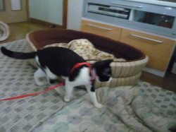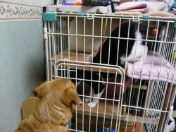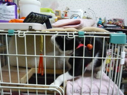 年02月25日 小豆が帰っ てきました ついさっき小豆を迎えに行って、帰ってきました。小豆の手術は無事終わりました。お医者さんの話だと、小豆は結構おとなしくて、ご飯もあまり食べ なかったそうです。外を怖がるニャンコは、よその家に行くとじっとしていることが結構多いそうで、小豆も怖がりなので、きっとそうだったのでしょう。「お うちに帰 ると安心して、ご飯をしっかり食べるかもしれませんよ。」と、言われていました。 家に帰ると、久しぶりのケージです。小豆を見ていると、さっそくご飯は食べるは、ウンコはするは、ウンコが終わるといつものように右手で、ケージについ ているビニールシートで手を拭くわで、手術する前とまったく変わっていません。きっと、いつもの家だから安心したのでしょう。 私としては、これでまた3姉妹(お姉さんを入れて4姉妹)がそろってハッピーです。 (左)ケージに入るや、ケージの上のものをとろうといたずらを始める小豆 (右)心配そうに見ているマリーを横目にご飯を食べている小豆 小豆を見ると、もう自分のウサギベッドに入って眠っていました。 |