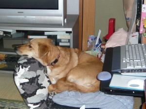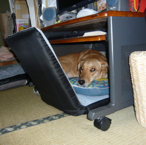 年08月09日 エー!! 今日も花火なの?? 今日は土曜日なので、お父さんが私たちの散歩の当番です。朝の散歩が終わった後、仕事があるからと言って、会社に行ってしまいました。でも、会社から 「夕方の散歩もお父さんが行くから」と電話があったそうです。ところが、お父さんが帰ってきたのは、8時前。やっと、これから散歩です。 家を出たとたんでした。どこでやっているのか、花火の音が!!! おしっこもそこそこに、戻りました。 今日はマリーはどうした?? いつもの洗面所にもお風呂にもトイレにも(トイレに逃げ込むこともあります。)、それと小豆のキャットタワーにもいません。みんなで、「マリー!!」と 呼んでいます。 いました。入ってはだめな畳のお部屋の中に。しかも、なんとお母さんのパソコン用の座椅子の上に座っています。 その時、大きな音で花火が鳴りました。マリーはお姉さんのパソコンデスクの下に一目散。どうやら、いろんなところに隠れ場所を見つけたようです。 ![]() 花火が鳴り始めたころ、お母さんのパソコン用の座椅子の上で、背もたれに顎をのせています。 ![]() 花火が本格的に鳴り始めると、今度はお姉さんのパソコンデスクの下に入り込んでしまいました。 今年は、雷も多いし、花火もいつもより多いと思います。地球温暖化防止の