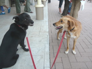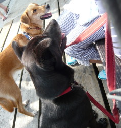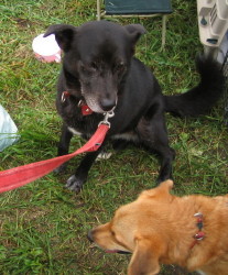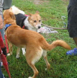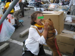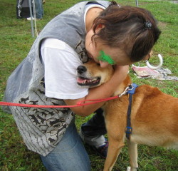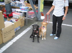 年09月27日 今日は千葉 わんのフリマです 朝の散歩が終わって、家に戻ると食事の後、お父さんはそのまま庭のほうに私たちを連れて行ってくれました。庭に出るのは久し ぶりです。今年の夏はものすごく暑かった上に、雷が多かったので、ずっと家の中で過ごしました。9月も終わりのほうになって、やっと庭に出られるように なったようです。 マリーは早速、高速耕運機で、穴掘りを始めています。近所のおばさんや小学生たちは「ラブちゃん、マリーちゃん久しぶりだね」と言って声をかけて行って くれます。 昼からは、お母さんたちと千葉わんのフリマに行きました。大井競馬場の駐車場でやっています。あいにく、ここは芝生ではなく、アスファルトの上でした。 千葉わんのコーナーを見つけて。「アッ。るる母さんだ。」 気がつくが早いかマリーはそちらのほうにどんどん行きます。まともや出ました、ペロペロ攻撃で す。本当に、マリーはやさしい子です。今日は、雷が鳴らないので、その分、テンションが高くなっています。 私たちをお父さんに預けて、お母さんはフリマでお買い物です。何を買ったかわかりませんが、お姉さんのものを買ったようです。 マリーのペロペロ攻撃。マリーはハッピーハッピーです。どれ、私はフリマを一回りしてこよっと。 ちゃんとお座りして待っていたのですよ。 お母さん、私たちのおやつはなかったの?? 「ラブの日記」へのメッセージを書き込むところを作ってもらいました。私
