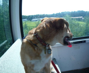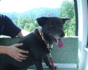 マリーは半分お父さんが抱きかかえて、ゴンドラに乗ってきました。 網目の階段、動くゴンドラへの飛び乗り、もう何が何だかわかりません。ゴンドラに、乗ったら、お父さんがシートの上に上げてくれました。 ![]() ゴンドラの中で、シートの上にあげてもらいましたが、ゴンドラが柱の横を通るとガタっと大きく揺れます。 おとなしく、シートに座っていたら、ラブは「おとなしいね。怖くないのかな?」と、お父さんたちが言います。 本当は、怖くて動けなったのです。 ![]() ![]() ![]() マリーもはじめのうちはシートに座っ