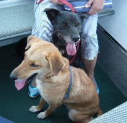 年08月15日 ロープ ウェーに乗りました 朝、お父さんが散歩の前にご飯を出してくれました。これは、「これから、自動車に乗ってどこか遠くへ行くぞ」の合図です。大 阪には、お葬式に行ってきたばかりだし、どこに連れて行ってもらえるのだろう? 9:00頃、自動車に乗せてもらってお父さんとお母さんと出発です。お昼過ぎについたのは、ハンターマウンテンスキー場でした。ここに着くまでに、山の 中を右に曲がったり左に曲がったりしながら進むので、マリーは吐いてしまいました。マリーはだいぶ車に強くなったとは言え、まだ、急な山道はきついようで す。 さて、このスキー場は夏の間は、ペットも一緒にロープウェーに乗れるようになるので、山のてっぺんまで連れて行ってもらえます。自動車から降りて、ゴン ドラ乗り場へ。ところが、ゴンドラ乗り場までの階段は、もともとがスキーのための階段なので、雪を落とすために、網目になっています。網目のところは嫌い です。家の近くの溝も、いつも網目のカバーのところは飛び越えます。この階段は、しかも、下の地面まで見えます。かなり、高い所に登っています。いつも は、怖がりのはずのマリーが、先に登っていきます。お母さんに、「おいでおいで」と、言われて、上だけを見て登っているようです。 でも、私は、怖い。網目が怖い。下が見えるのが怖い。お父さんが、笑いながら、引っ張っていきます。それに任せて、ともかく上まで登りました。今度は、 変な箱が目の前を通って行きます。ゴンドラとかいうやつです。 ![]() 怖い階段を登りきったら、変な箱が動いています。これから、何が始まるんだ?? お母さんがチケットを買って、うれしそうに私を引っ張っていきます。箱の