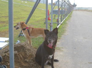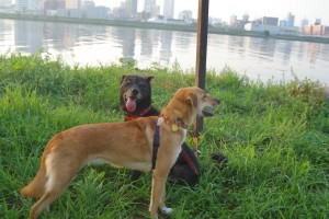 今日は、小豆はお留守番です。寂しくないかな? お兄さんやお姉さんたちの言うことを聞いているのかな? でも、多分、聞かないで勝手なことをして、ニャーニャー叫んでいるでしょう。 夕方、いつもより早く、大阪のおじいさんの家に着きました。 13日 淀川の堤防の河川敷を散歩しています。数日前に花火大会があったとこで、まだその時の会場の機材が残っています。朝早くから散歩に連れて行ってもらいましたが、ものすごくむしむししていました。お父さんは、汗びっしょりで、散歩の後、シャワーを浴びていました。私たちは暑くても遠慮しておきます。