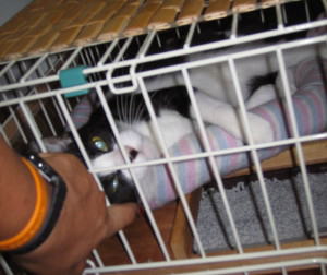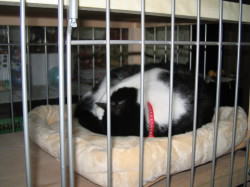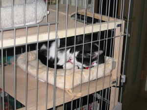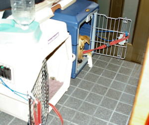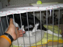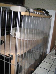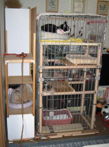 | 09年10月31日 小豆の新居&お風呂(小豆がおとなしくなりました) 先週からお父さんがガレージの方で何か作っています。私たちは、久しぶりにお外の子です。天気がいいので、お庭でのんびりしていました。近所の人たちは、「ラブちゃん、マリーちゃん。久しぶりね。」と、なでて行ってくれます。 さて、お父さんが作っているものができました。小豆の、ケージの中の棚です。 小豆がだいぶ大きくなったので、ケージを新しいのにしたそうです。そういえば、和室に何かそれらしいものがありました。私は、和室が立ち入り禁止なのでよくわかりませんでした。お父さんが、作っていたのは、その中の棚だそうです。小豆が大きくなったと言っても、普通のニャンコよりは小さいので、小豆の大きさに合わせた棚の高さに組み替えたそうです。それと、一番上を広く取って、上から部屋の中を見渡せるようにしたそうです。