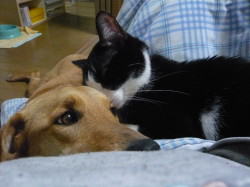 マリーが来たのであわてて、愛想を振りまいています。マリーの耳をペロペロなめています。 |