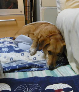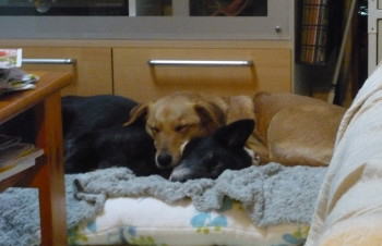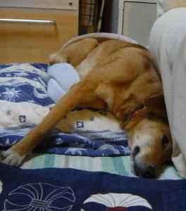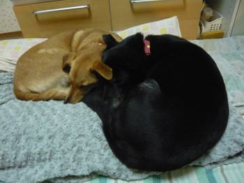 夜になると、まだまだ寒いです。夜のご飯を待っている間、フカフカのお布団でお休みです。気がつくと、マリーは私とまったく同じポーズで寝ています。