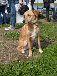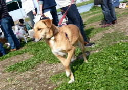 | 犬親会の会場に着いた途端にノリノリのマリーです。あっちにるる父さんたちがいるんだよう。お母さん、行こうよ。 |