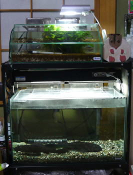 下の段の水槽が新しくなりました。全面ガラス張りの水槽で、新しいので水が透き通って見えます。右上のハムスターは、お魚たちのご飯が入っています。 |