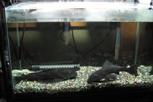 下の水槽です。ここには、プレコが2匹います。十数年生きています。一度那須に連れて行き、戻ってきました。 |