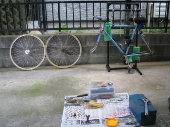お父さんが自転車を持ち出して何やら始めました。どうやら、全てのベアリングをグリースアップするようです。写真は、専用の工具を出して、自転車の前輪と後輪を外したところです。これから、全て回転部分をチェックするそうです。