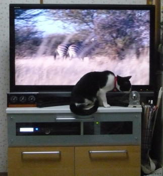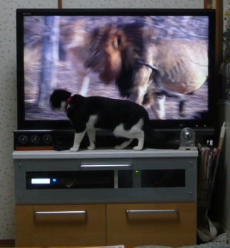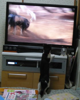 画面が切り替わって、ライオンが出てきました。血が騒いだのかもしれません。ライオンと一緒にテレビの前を歩き始めました。 |
