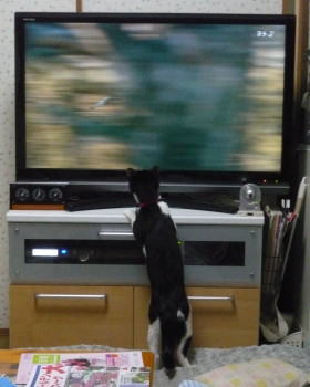 真剣なまなざしでしょう。小豆はテレビが大好きです。 |