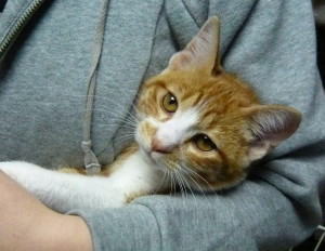 お姉さんに抱かれた茶太郎君です。抱かれた時から、喉をグルグル鳴らしています。