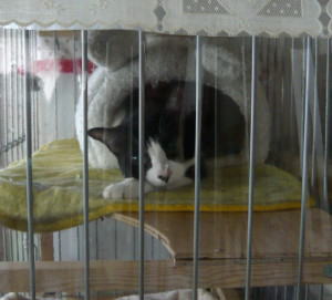お医者さんに行く前にバリケンに入れられました。ここでも中で暴れないか見守っています。(→) |