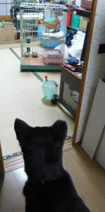 (←)茶太郎のケージは和室の中にあります。私は、和室に入るのを禁止されているので、その前でじっと茶太郎を見守っています。