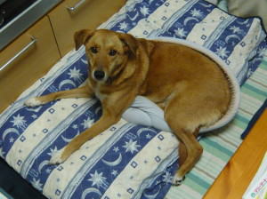夜、私たちがケージに入って寝ると、小豆は自分のケージから出てきて、ファンヒーターの前でだらしなく寝そべっています。近頃はマリーと同じようにあごをもたせかけて寝ています。小豆は本当にニャンコでしょうか?どうやら、いつも私たちの様子を見ているので、やっていることがどんどんワンコ化しているようです。