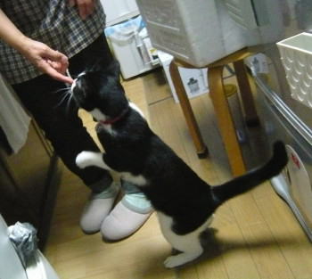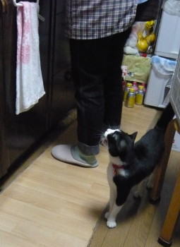 私達や小豆のご飯の準備をしているお母さんの周りから離れません。お母さんの足元をグルグル回っています。 |