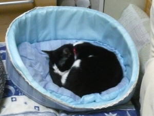 私たちが寝てしまうと、小豆が部屋中を駆け回ります。小豆はマリーが大好きなので、一休みするときはマリーのベッドです。毛づくろいをしています。 |